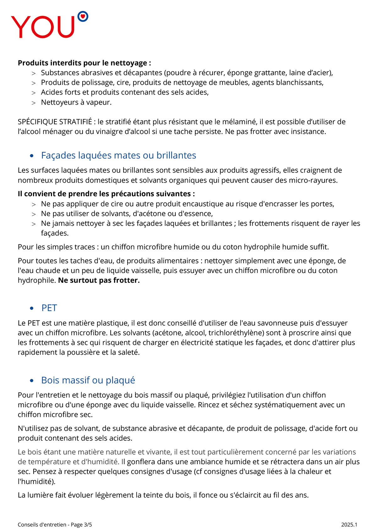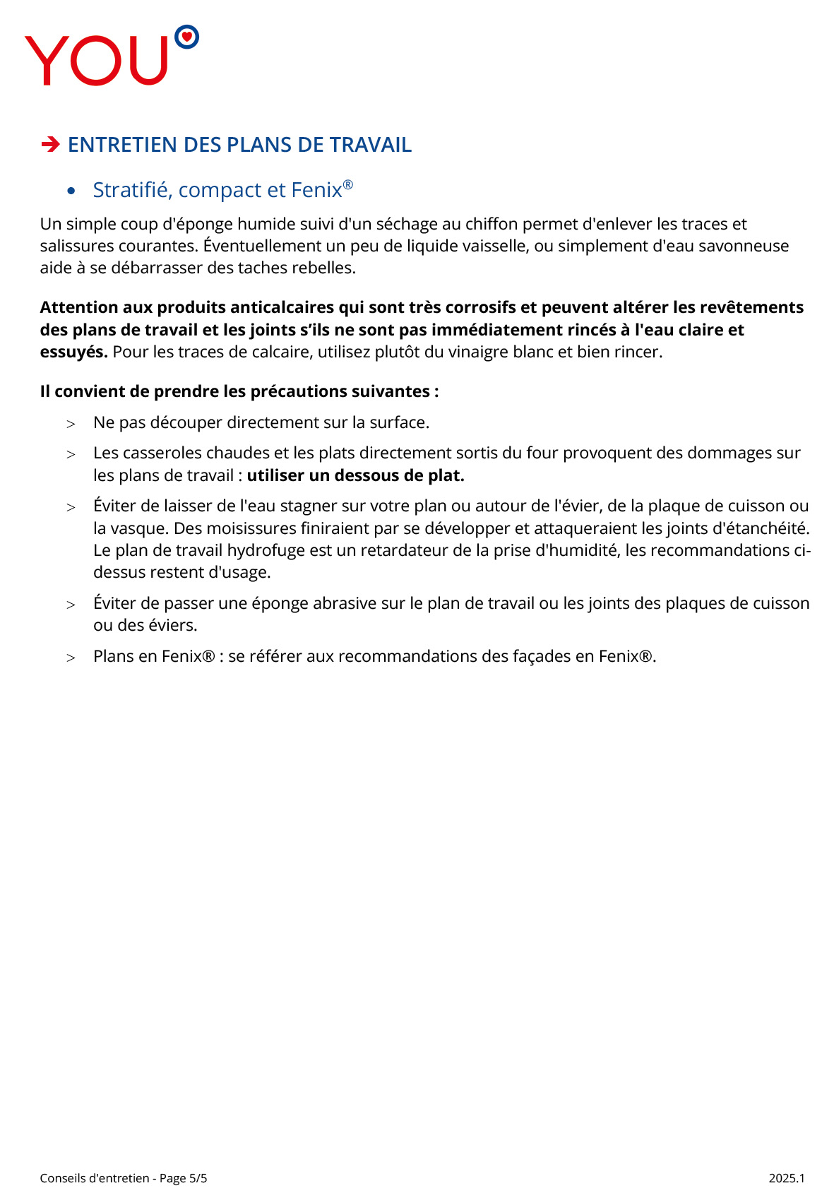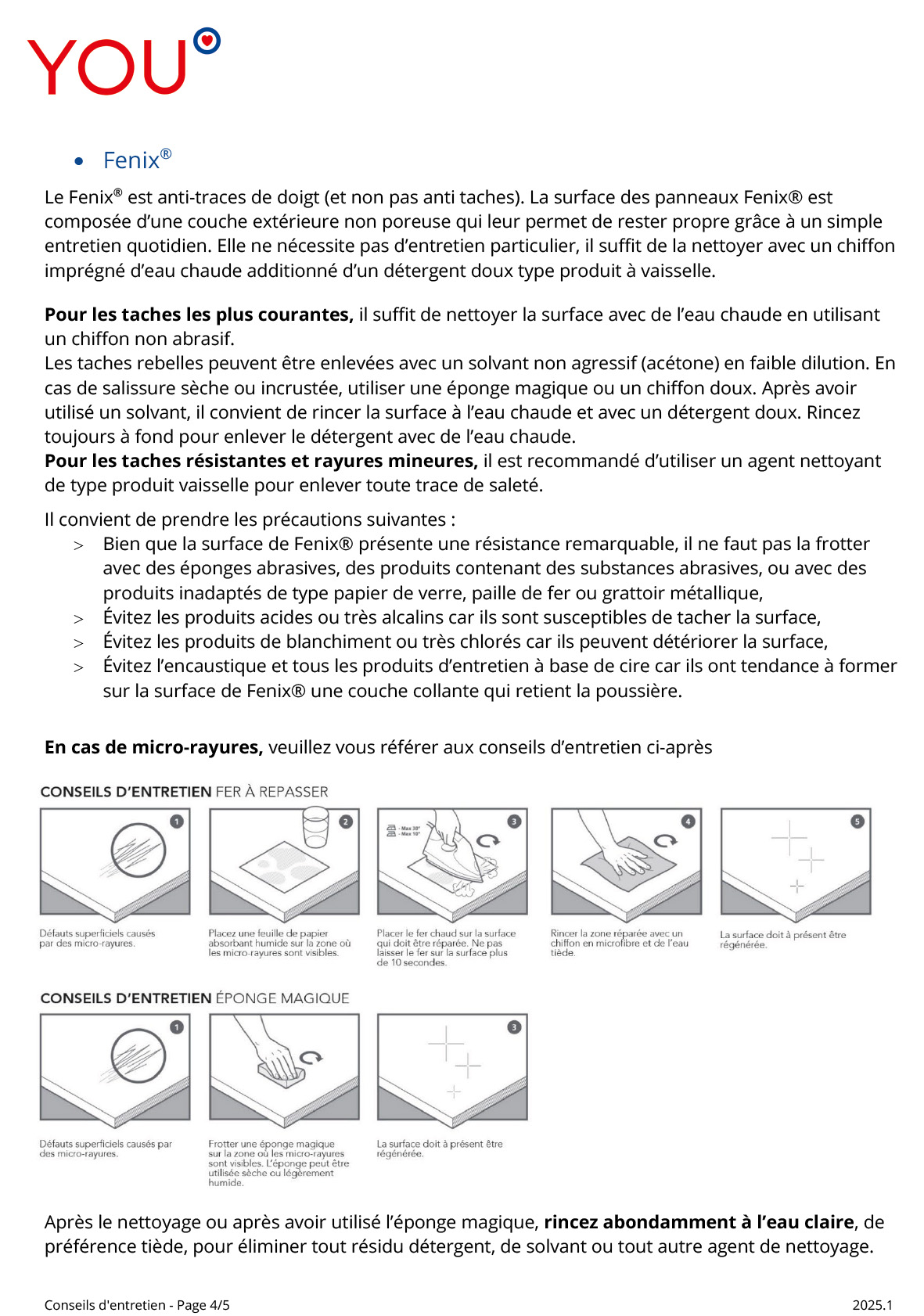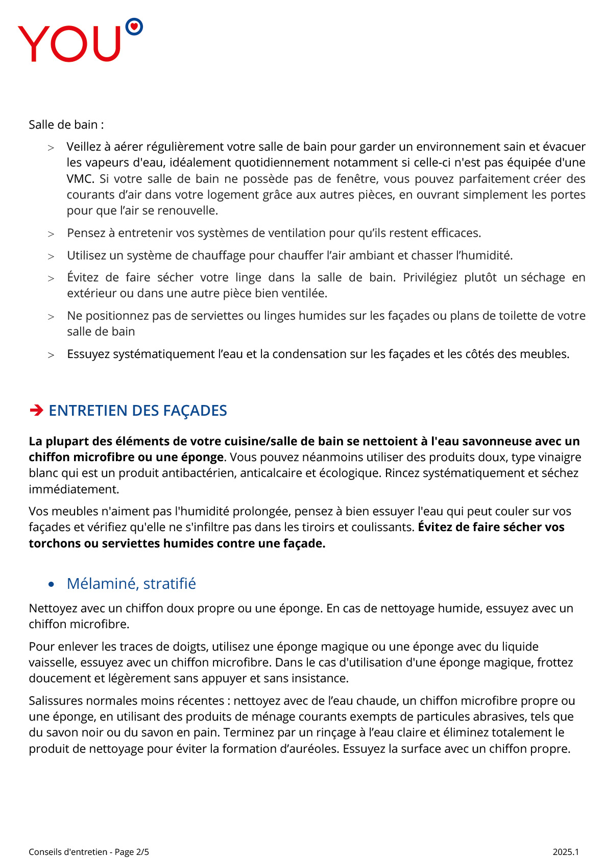 - Entretenir régulièrement avec un chiffon légèrement imbibé d'eau savonneuse (ou du vinaigre blanc dilué pour les revêtements stratifiées et mélamines) puis essuyer soigneusement avec un chiffon sec.